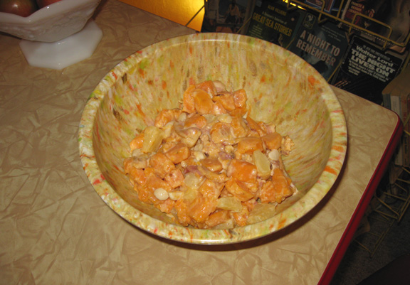 I made my well-known sweet-and-sour chicken for a working party the other night and I'm pleased to say it was a hit. I also made a couple of new recipes, including a dip from the Hawaii Kai Cookbook, which features oyster sauce and which I served with two different kinds of rice crackers, and this sweet potato "salad," featuring everyone's favorite salad additive, bacon!