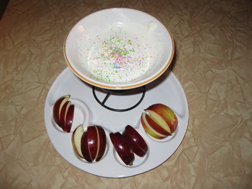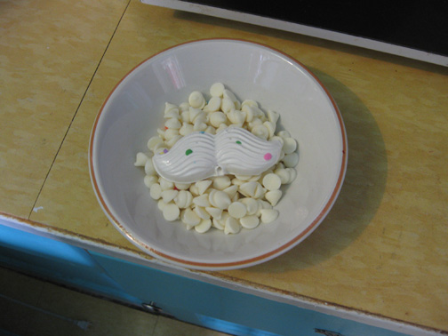 I'd already made rum balls and red velvet cookies, plus tried out some recipes for our party in a couple of weeks, which were all fun and yummy, but things took a turn for the truly lunatic when our great pal Zach, who came up for the weekend, gave us a lollipop in the shape of Rip Taylor's mustache, which he'd gotten for us at a collectors' convention in California some time ago. He'd kept it alive in his fridge and it was no worse for wear, but it seemed kind of anticlimactic to just devour it, so I got the bright idea to fondue it with white chocolate. Since he's famous for tossing confetti, I added some sugar sprinkles for decorative purposes. It was really yummy and I'm pretty sure we were the only people eating Rip Taylor mustache fondue on Sunday!