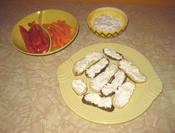 I found myself at Shop Rite with very little time to spare before the drinks would be flowing. I whipped up a garlic herb dip from half a container of sour cream, three cloves of minced garlic and a couple of generous dashes each of sage, rosemary and marjoram, with salt, black pepper and cayenne pepper for good measure. I also picked up a can of fancy crab meat, which I mixed with mayo, salt, pepper and cayenne pepper and spread on bagel chips. Paul especially loved that. I set out some olives and we had an appetizer banquet fit for a king, for very little time or money! Never let a shortage of either bother you. Our first ever happy hour, celebrated when we still lived in New Rochelle, about eight years ago, was a spur of the moment idea. Of such ideas are traditions born!