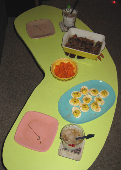 I'd made faux rumaki before, which is really easy, but I'm thinking these might be even easier and they're so good. I took my inspiration from a Betty Crocker recipe, starting with cutting bacon slices in half, sprinkling them with basil, and slicing slits in the dates, which I stuffed with pistachios. I rolled the dates in the bacon and baked at 425 degrees for about 20 minutes. These will definitely appear at future parties, since we loved them!