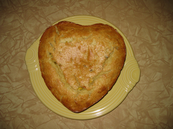 I made a really yummy and impressive looking chicken dish from the Hawaii Kai Cookbook during the week, but naturally I neglected to take any pictures of it. Therefore, I give you my heart-shaped banana bread: