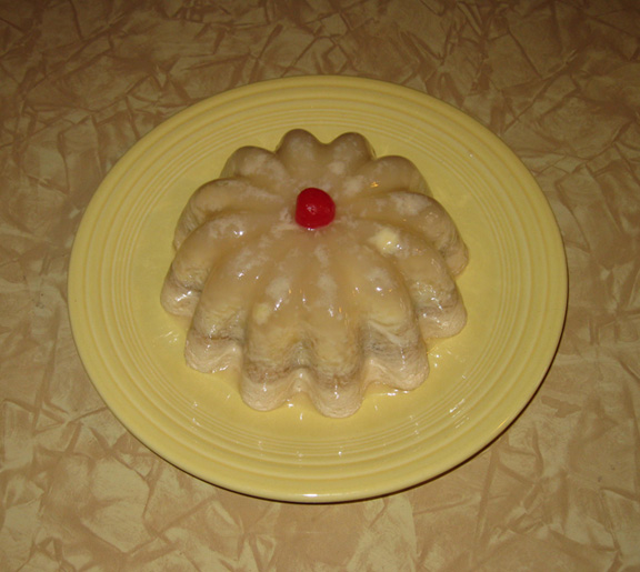 I love how this looks complicated, but really only involves a few steps. You pretty much prepare gelatin, add three mashed bananas, some sugar and lemon juice, then some heavy cream, which has been whipped until it's stiff. Pour into the mold and let it harden. It's light and sweet, but not overly so, which is nice. We may not be able to visit the late, lamented Hawaii Kai, but it's fun that we can at least cook some of their dishes!