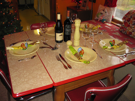 I was watching Sandra Lee's show when my family pulled into the driveway for their Thanksgiving visit and she'd just finished talking about her "tablescape." That word cracks me up--it's so pretentious--but I've adopted it nonetheless and am now creating tablescapes at every opportunity. We have zillions of dishes and serving pieces. Might as well put them to work!