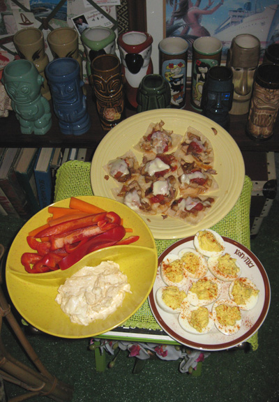 Between cranking out one new episode of "Velveteen Lounge Kitsch-en," writing another to shoot next weekend, sewing multiple garments and prepping our tent for Ohana, it was another week of minimal cooking and shopping. Luckily there was stuff in the fridge I could turn into a decent Friday night happy hour!