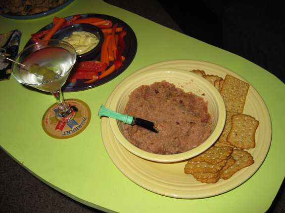 I'd made a meatloaf of SPAM as a dress rehearsal for this week's episode of "Velveteen Lounge Kitsch-en" and was looking for ways to get rid of it, since I had make ANOTHER for the actual shooting day. Microwaving it for one minute, then mashing, created a lovely pate, just right for spreading on crackers for happy hour. SPAM lends itself to limitless options, from sushi to pizza to pate. It's like an art medium!