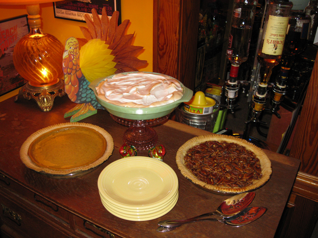 Featured here are chocolate meringue, pumpkin and maple-bourbon pecan pies. As of this writing, the pecan is gone, the chocolate is mostly gone and we have some pumpkin left, which is good, as it's one of my favorites. I like to think there was something for everyone. More pies coming soon!