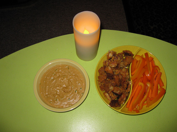 The dip is ginger-peanut and employs fresh ginger, garlic and green onions, so it was very tasty, as well as easy to prepare. I served it with veggies and these oven fried chicken chunks, which were also easy--shaken with biscuit mix, crushed corn flakes and spices and baked. The most labor intensive part was cutting the chicken into chunks, so I'll call both of these recipes winners!