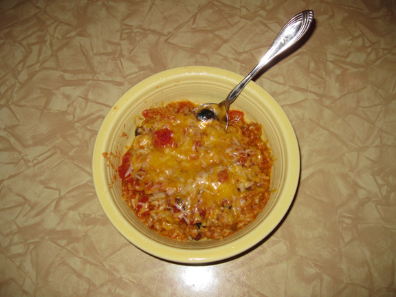 I call it "Mextalian Casserole" and it came about because I was having a day when I would rather have died than gone to the supermarket, so I was forced to be creative with whatever we had on hand. I made rice in a broth of water, orange juice, dry vermouth, sriracha sauce and spices, which I combined with some leftover homemade chili and black beans. I topped that with salsa and cheese and microwaved it until the cheese melted. It came out really well, so I was pleased!