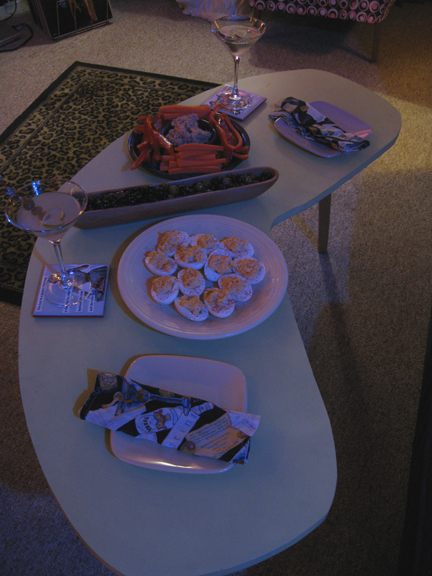 Deviled eggs, olive boat, crudites and martinis--all happy hour classics. The dip is a "tangy Thai" recipe, featuring a tofu base, the eggs are curried and the olives were roasted with Herbes de Provence, garlic and red pepper flakes. It was yummy and we have leftovers!