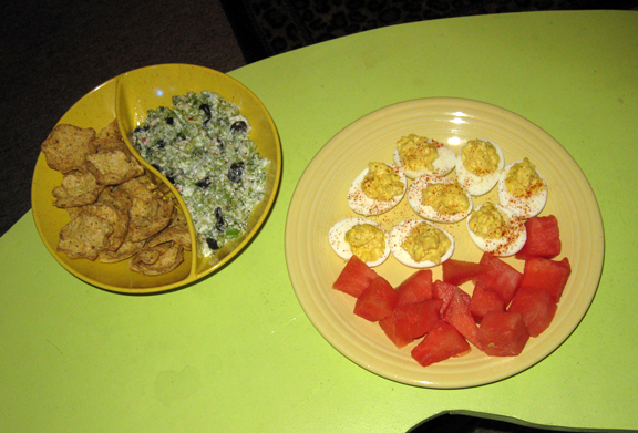 Friday was a busy day for me and, even though the market is about 90 seconds from our house, it seems as if any trip there lasts at least 45 minutes. No thanks. Fortunately we had plenty of raw materials for appetizers in the kitsch-en, including broccoli, plain yogurt, garlic, black olives and a full spice rack. It came out great and we scarfed it down!