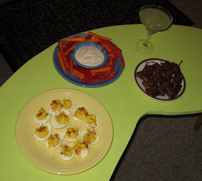 We were crazed, trying to get ready to shoot an episode and catching up from Ohana, so I threw together some old favorites, including curried deviled eggs, faux rumaki and veggies with a spicy yogurt dip. It may not have been brand new, but it WAS good!