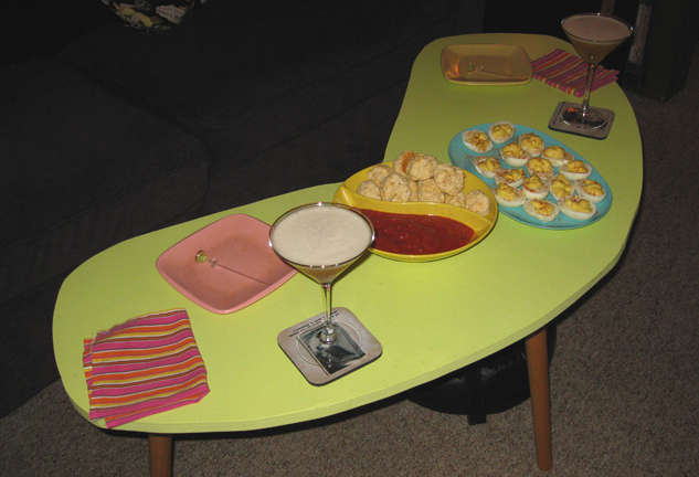 Last week was crazy at the Velveteen Lounge. Trips to the supermarket, which can be fun under the right circumstances, felt like a huge chore, to be avoided whenever possible. Good thing we had some raw ingredients on hand! I'd made a marinara sauce on Wednesday night to go on pizza, so I heated some left over sauce up for dipping these little garlic-parmesan bites, which were based on the most basic Bisquick/Jiffy recipe of biscuit mix and milk. Ten minutes in the oven and you have appetizers! And the further good news is that just about anything (use your best judgment, of course) can be deviled in an egg. These are curry deviled eggs. I more or less took a recipe for curry dip, mixed it with the mashed egg yolks, and added copious amounts of salt, pepper and cayenne pepper, 'cause I'm like that. Easy and yummy! Stock your pantry with the basics and save yourself some time and effort in the future!