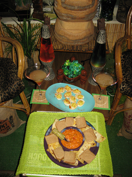 I'd hard boiled the eggs for the curried deviled eggs before we lost power, so those weren't a challenge, but my original plans for the rest of our food were foiled, so I needed to come up with some alternatives. I'd already decided that we'd fondue if power wasn't restored by the time we were ready to eat, but it came back on just in the nick of time, so I made this nacho cheesy spread in the microwave in about two minutes and sliced some corn tortillas into strips and fried them up in oil and pepper flakes, for dipping. I also toasted some bread, just to have dipping choices. The whole thing took about five minutes. Isn't it nice to know that yummy appetizers are always available, using ingredients you have on hand and in just a few minutes?