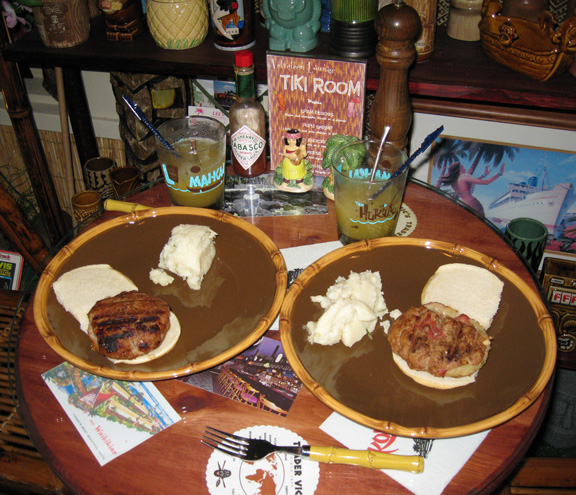I am so pleased with my new burger recipe, which is actually a mash up of two recipes. I've dubbed them Aloha Kitsch Burgers: